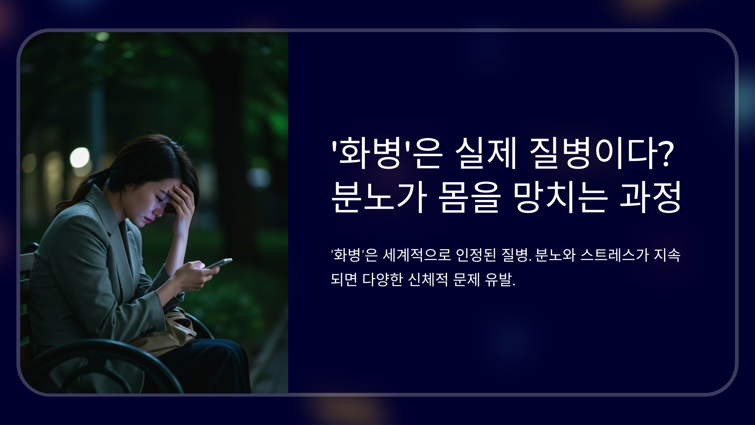 하지만 단순한 감정 문제가 아닙니다. 분노와 스트레스가 지속되면 신체 곳곳에 악영향을 미치고, 심각한 질환으로 발전할 수 있습니다.