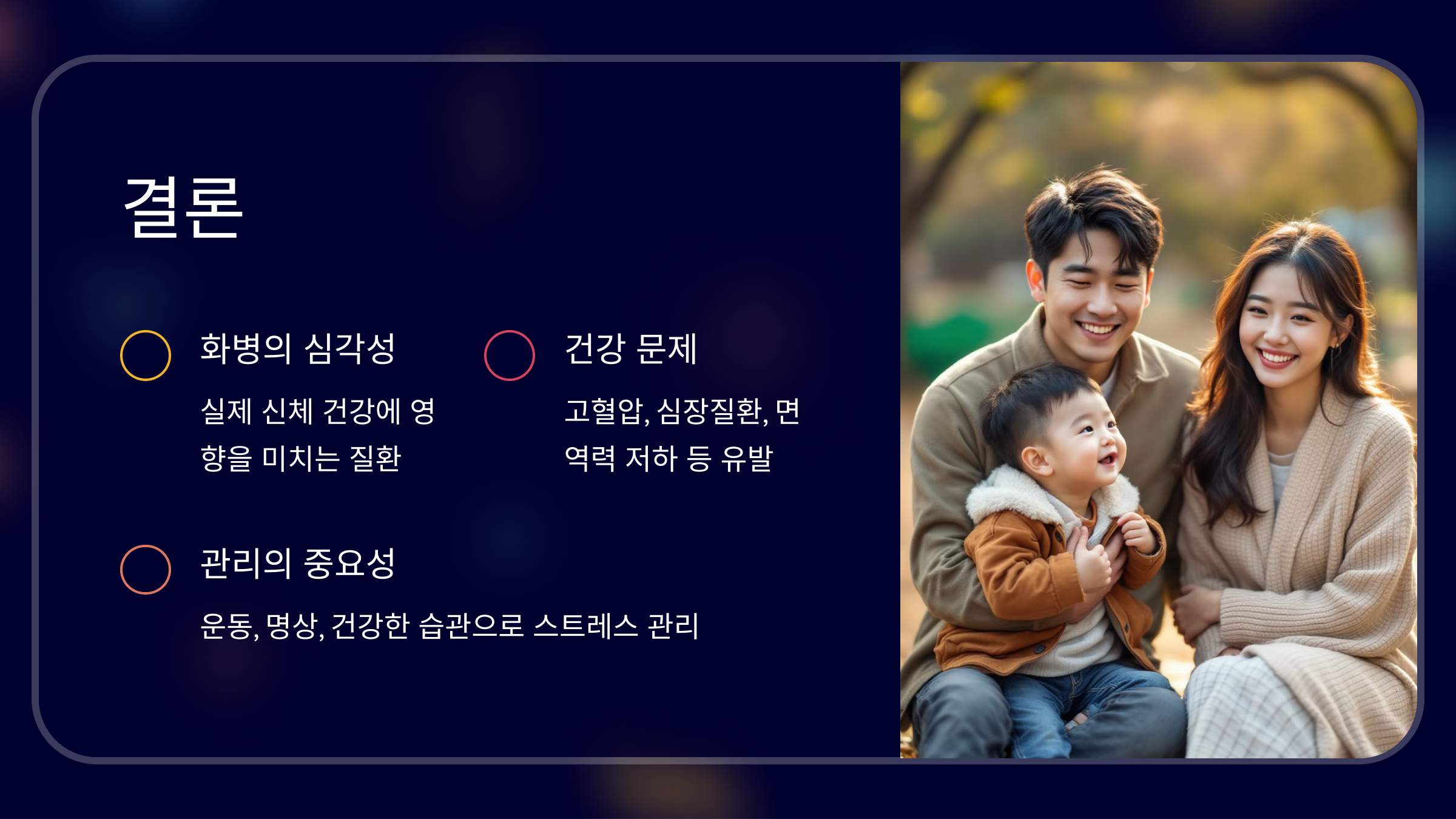 - 장기적인 영향: 지속적인 스트레스와 분노로 인해 고혈압이 발생하고, 심혈관계 질환 위험 증가
