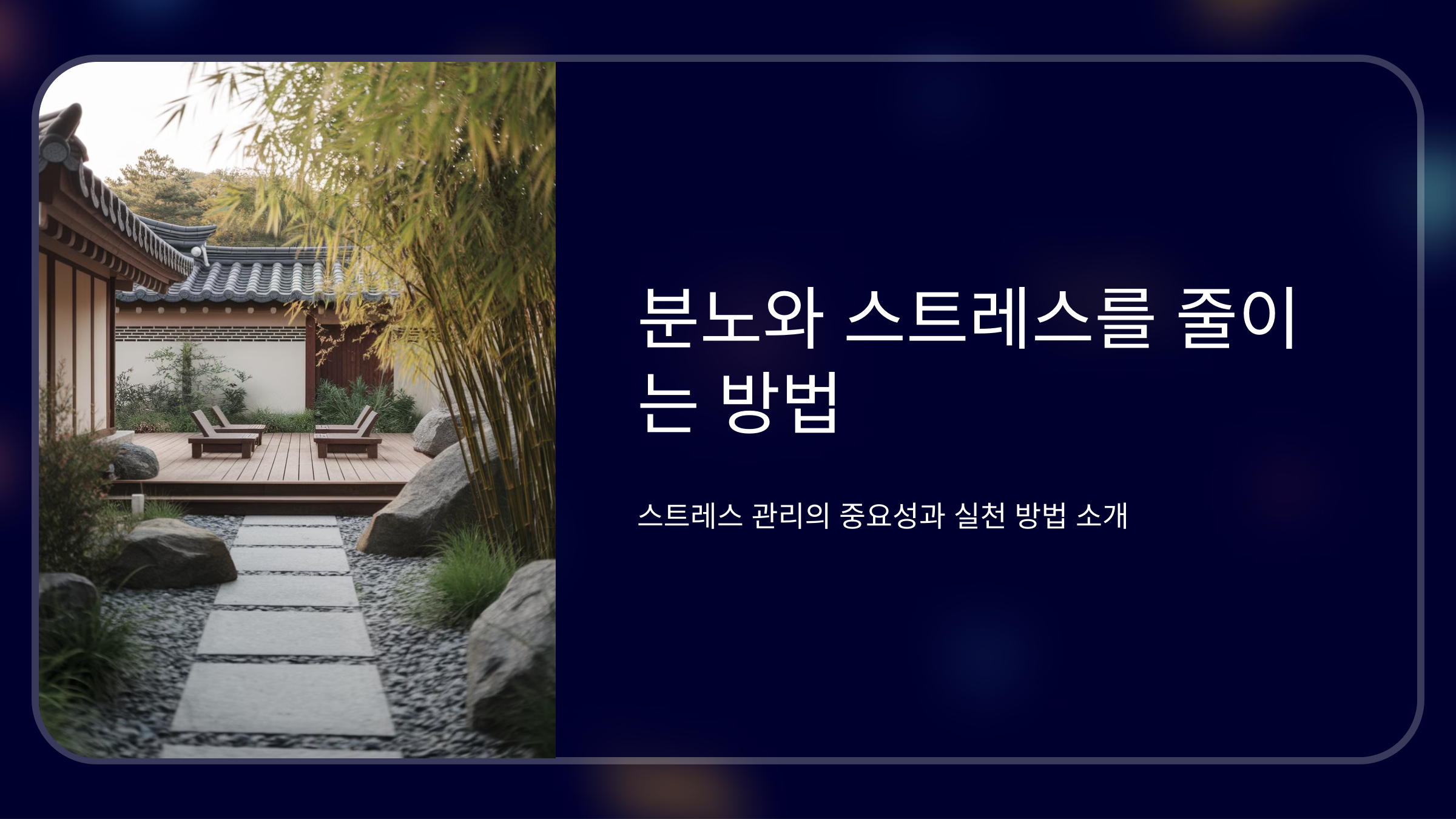 - 수면 부족은 스트레스를 더욱 악화시키므로 하루 7~8시간의 충분한 수면을 취하는 것이 중요합니다.
