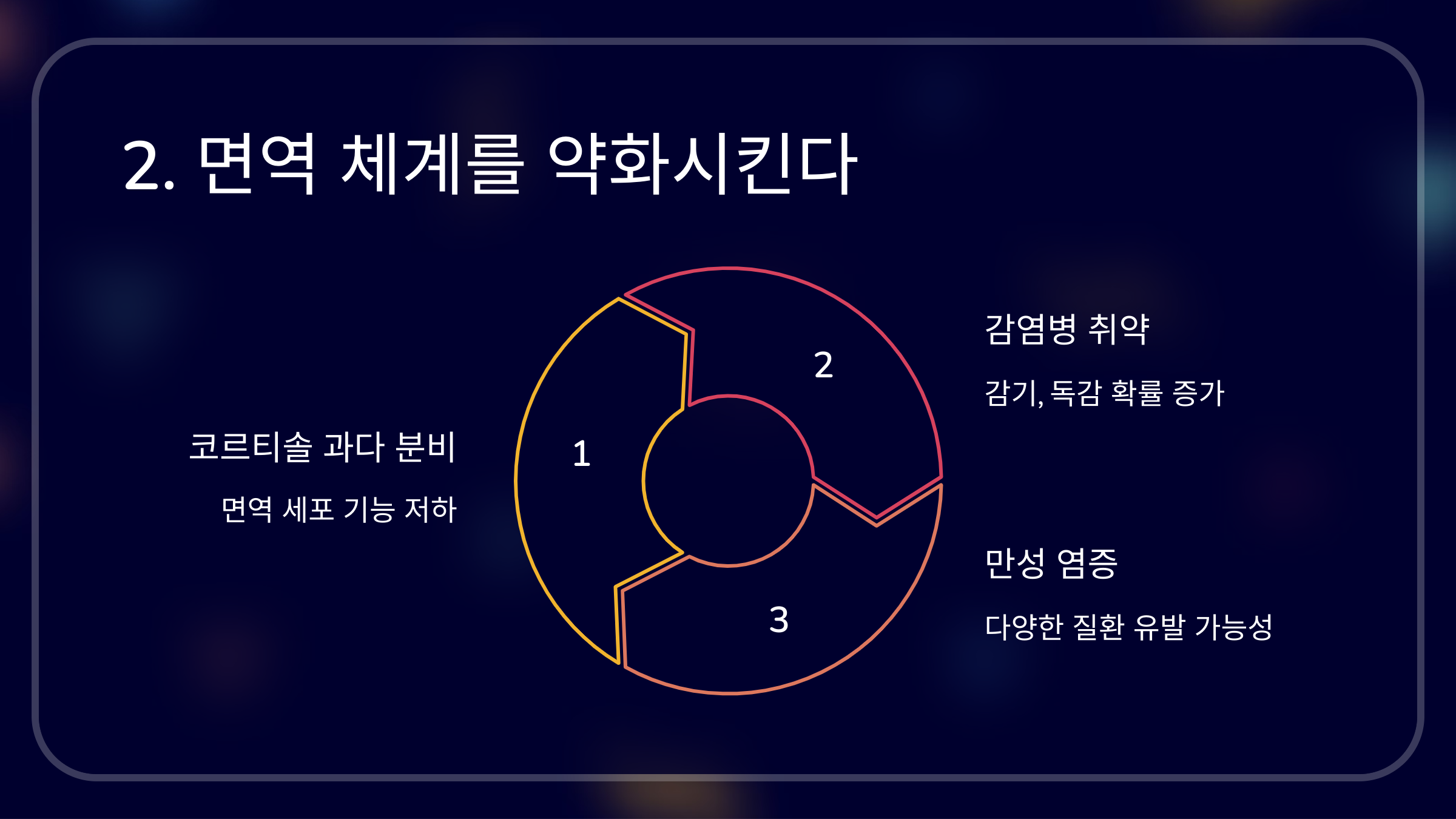 만성 스트레스는 면역 기능을 약화시키고, 신체가 외부 바이러스와 세균에 취약해지도록 만듭니다.