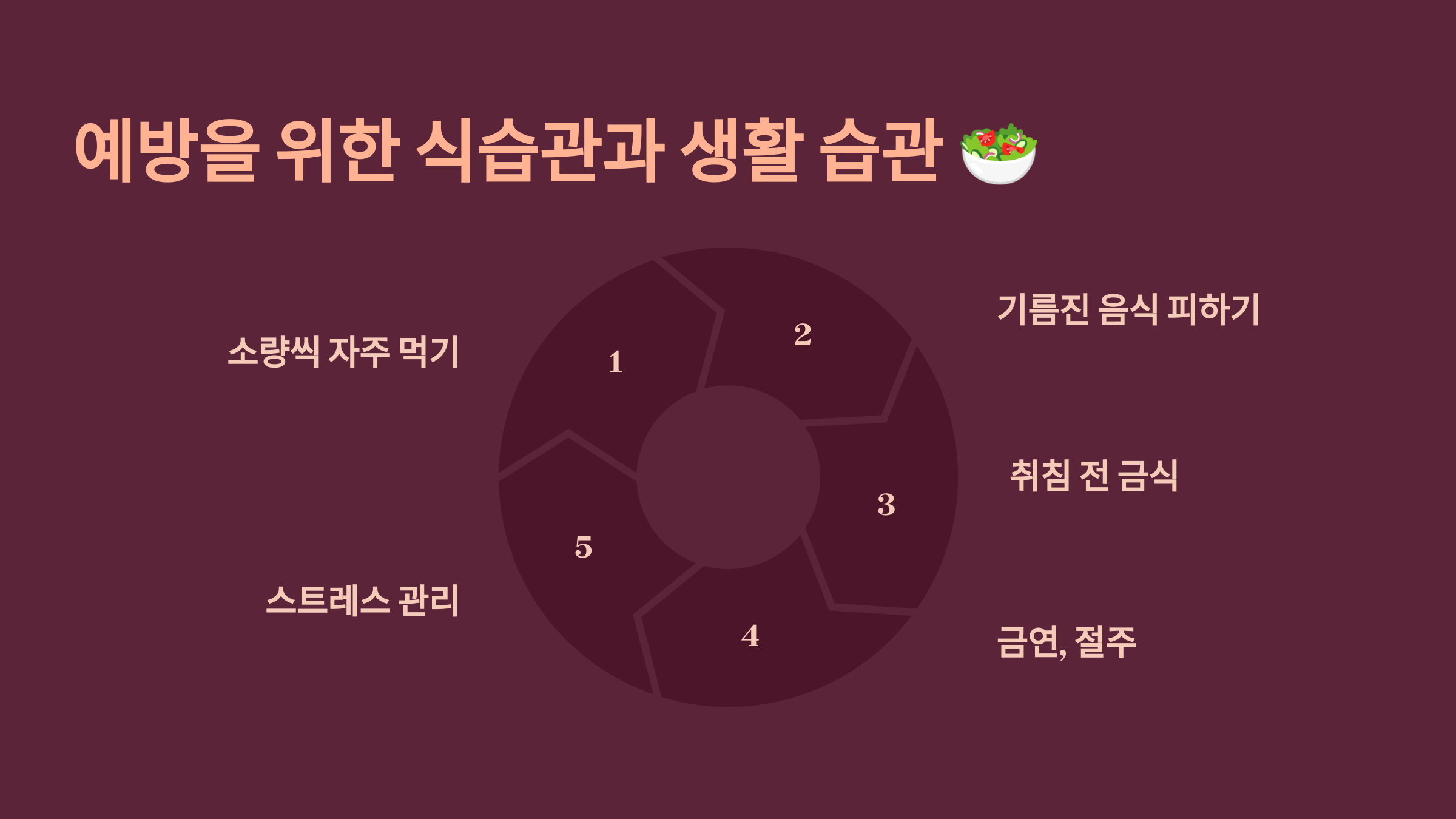 - 기름진 음식, 카페인, 알코올, 흡연이 원인이 될 수 있음