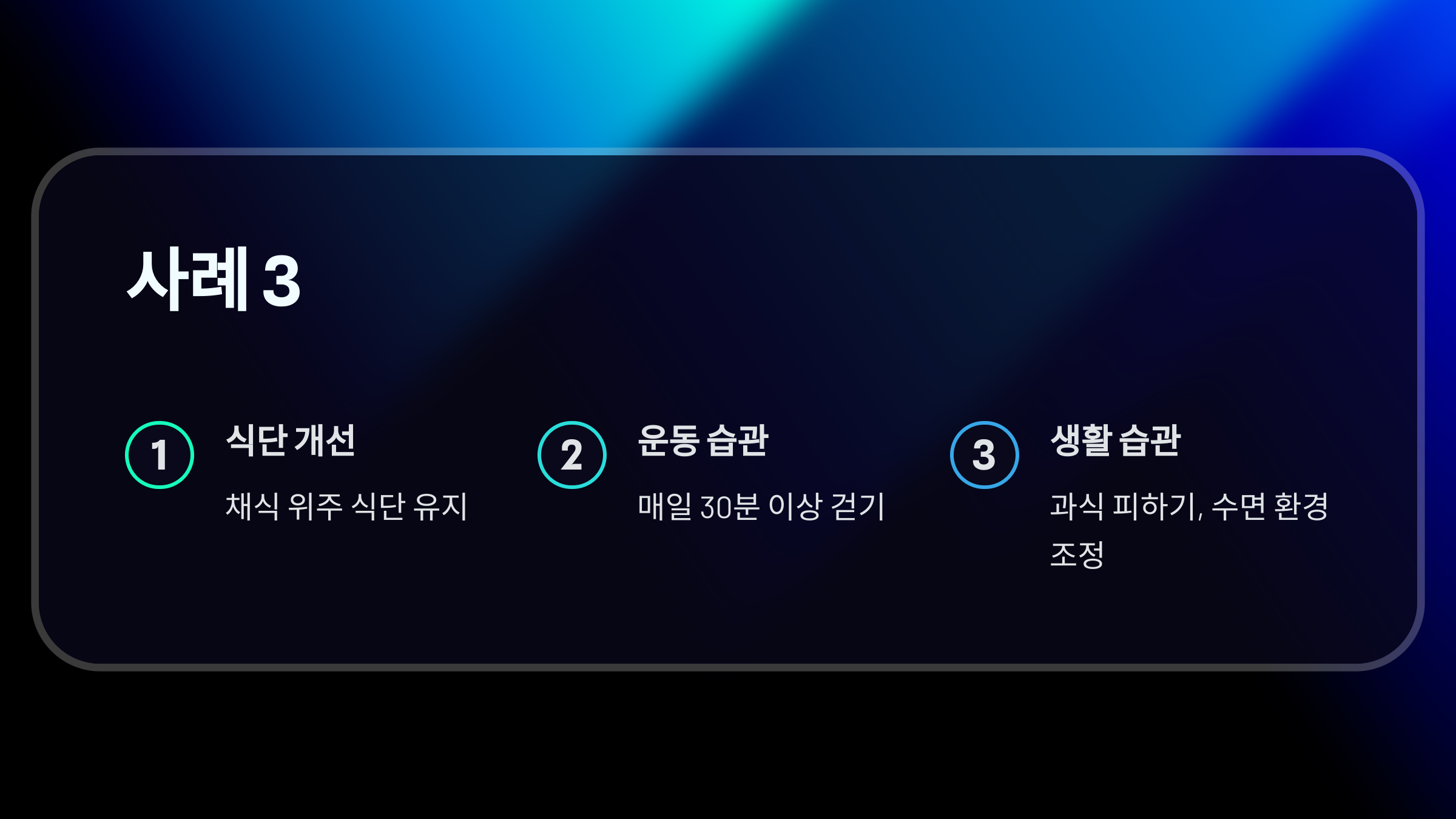 - 가벼운 운동 지속: 매일 30분 이상 걷기 습관