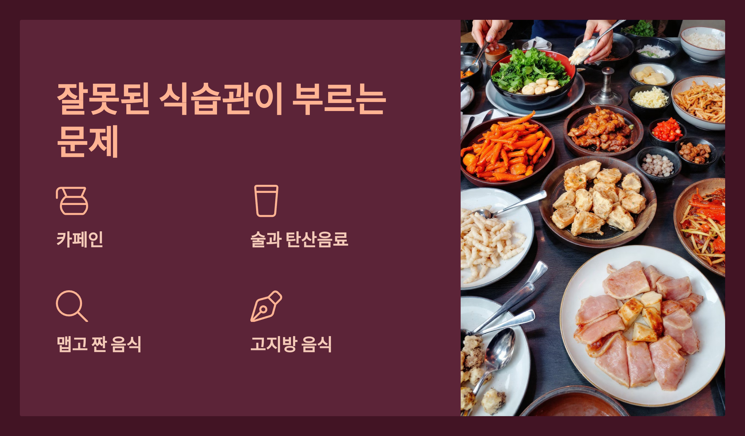 식습관은 역류성 식도염을 유발하는 가장 흔한 원인이에요. 특히 다음과 같은 음식들이 문제를 일으킬 수 있어요.