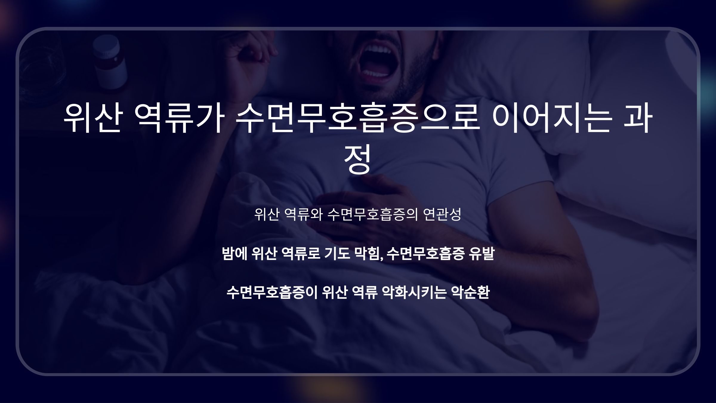 위산 역류가 심하면 밤에 기도를 자극해 수면무호흡증을 유발할 수 있으며, 수면무호흡증이 있으면 산소 부족과 교감신경 활성화로 인해 위산 분비가 더욱 증가하는 악순환이 발생할 수 있습니다.