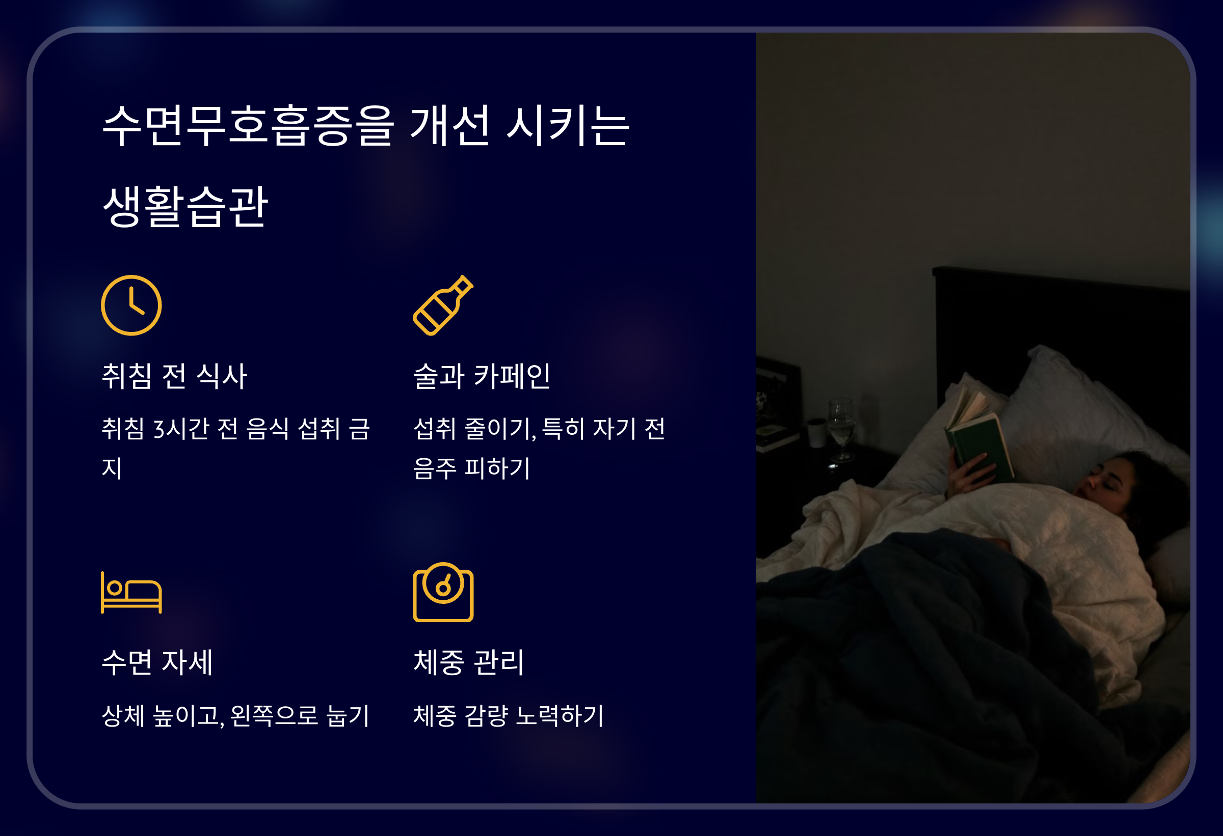 ✔ 술과 카페인 섭취 줄이기 (특히 자기 전 음주는 기도를 이완시켜 무호흡증을 심하게 함)