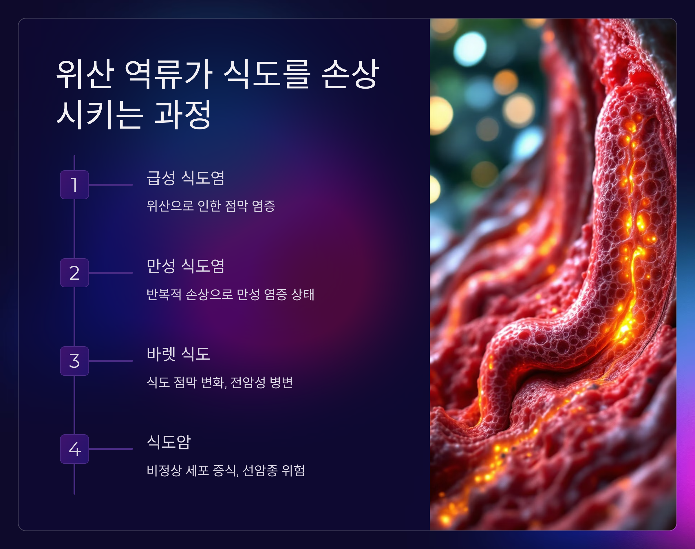 - 위산 역류가 지속되면서 식도 점막이 반복적으로 손상됩니다.