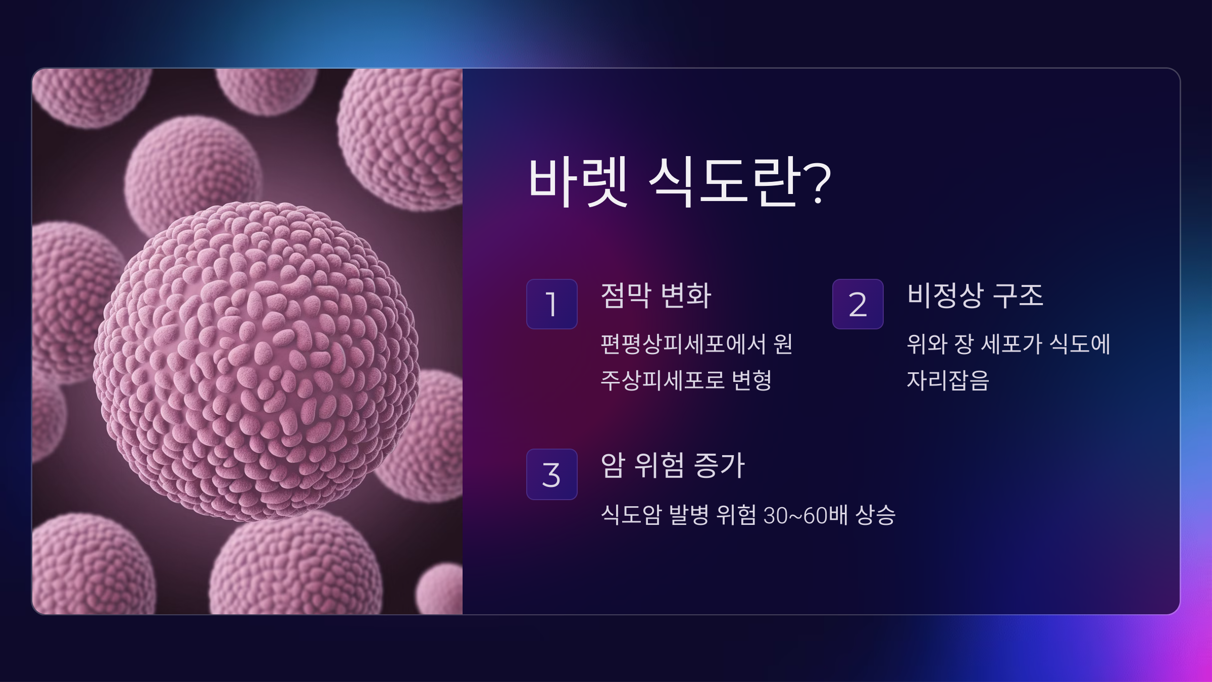 - 원래는 위와 장에서 볼 수 있는 세포가 식도에 자리 잡게 되면서 정상적인 세포 구조가 바뀝니다.