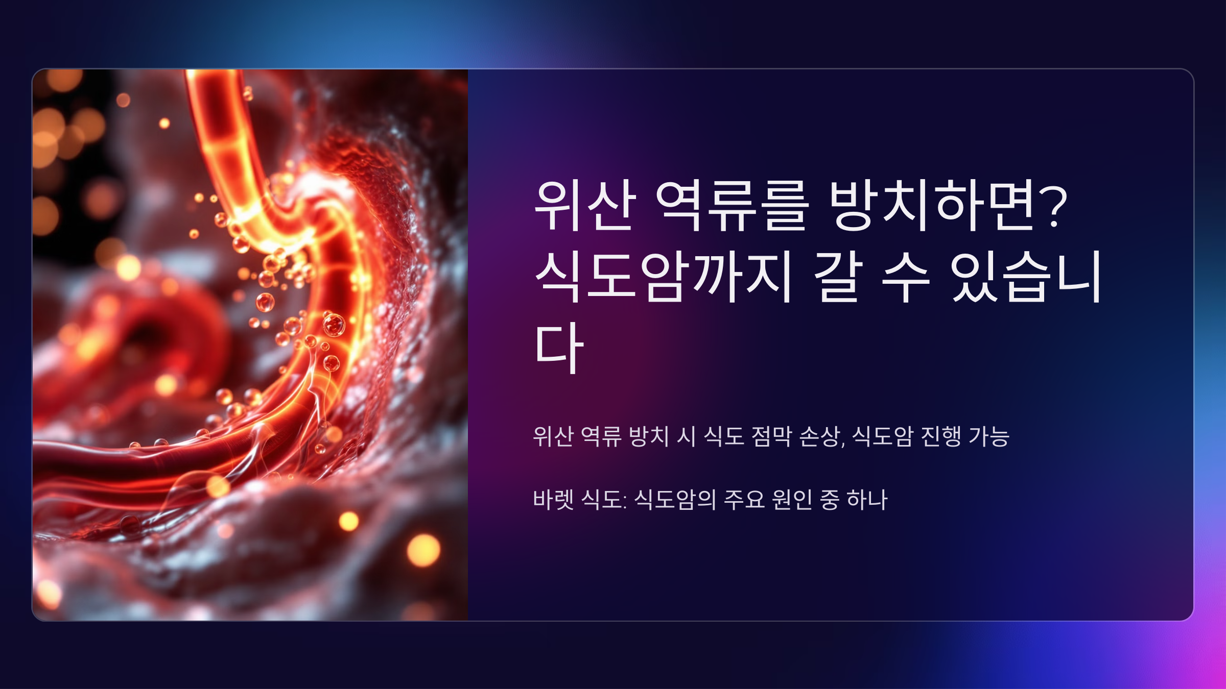 위산 역류가 심하고 오랜 기간 지속될수록 식도암으로 발전할 가능성이 커집니다. 특히 바렛 식도가 있는 사람의 10~15% 정도에서 식도 선암이 발생할 수 있습니다.